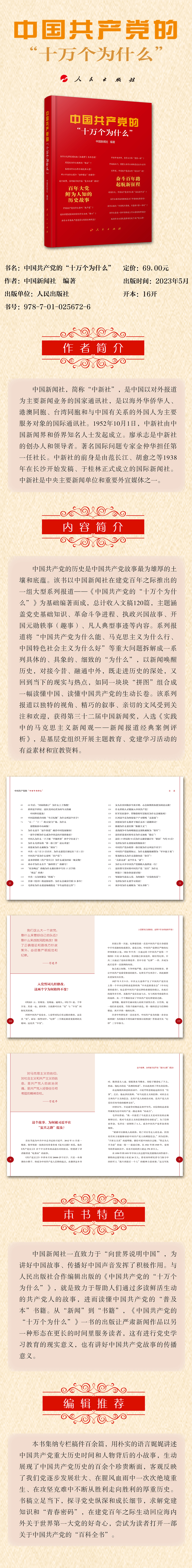 中國共產(chǎn)黨的歷史是中國共產(chǎn)黨故事最為雄厚的土壤和底蘊(yùn)。該書以中國新聞社在建黨百年之際推出的一組大型系列報道——《中國共產(chǎn)黨的“十萬個為什么”》為基礎(chǔ)編著而成,總計收入文稿120篇,主題涵蓋黨史基礎(chǔ)知識、革命斗爭進(jìn)程、執(zhí)政興國故事、開國元勛軼事(趣事)、凡人典型事跡等內(nèi)容。系列報道將“中國共產(chǎn)黨為什么能、馬克思主義為什么行、中國特色社會主義為什么好”等重大問題拆解成一系列具體的、具象的、細(xì)致的“為什么”,以新聞喚醒歷史,對接今昔、融通中外,既走進(jìn)歷史的深處,又回到當(dāng)下的現(xiàn)實與熱點(diǎn),如同一塊塊“拼圖”組合成一幅讀懂中國、讀懂中國共產(chǎn)黨的生動長卷。該系列報道以獨(dú)特的視角、精巧的敘事、親切的文風(fēng)受到關(guān)注和歡迎,獲得第三十二屆中國新聞獎,入選《實踐中的馬克思主義新聞觀——新聞報道經(jīng)典案例評析》,是基層黨組織開展主題教育、黨建學(xué)習(xí)活動的有益素材和宣教資料。
