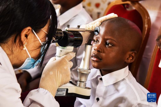 5月26日,在喀麥隆首都雅溫得,中國第22批援喀醫(yī)療隊的眼科大夫為“孩子為重”孤兒中心的兒童檢查眼睛。新華社發(fā)(科普索攝)