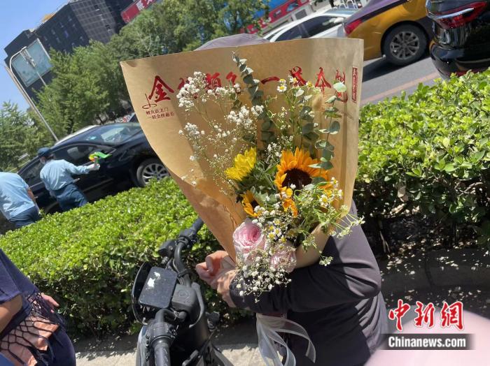 考試當(dāng)天,中新網(wǎng)見(jiàn)到不少家長(zhǎng)手捧鮮花等待迎接考生??匆?jiàn)小楊手上的“向日葵”和宣傳語(yǔ),原本并沒(méi)準(zhǔn)備花束的一位母親當(dāng)即決定購(gòu)買(mǎi)。