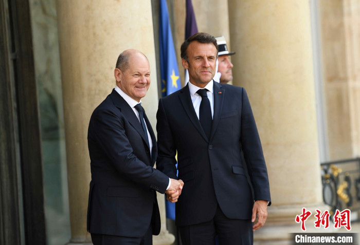 當(dāng)?shù)貢r間6月12日晚,法國總統(tǒng)馬克龍?jiān)诎屠钀埯惿釋m會見德國總理朔爾茨。朔爾茨前來出席當(dāng)天舉行的法德波三國領(lǐng)導(dǎo)人會談。 中新社記者 李洋 攝