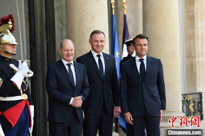 當(dāng)?shù)貢r間6月12日晚,法國總統(tǒng)馬克龍?jiān)诎屠钀埯惿釋m與德國總理朔爾茨、波蘭總統(tǒng)杜達(dá)會面。他們共同出席“魏瑪三角”機(jī)制下的三國領(lǐng)導(dǎo)人會議。 中新社記者 李洋 攝