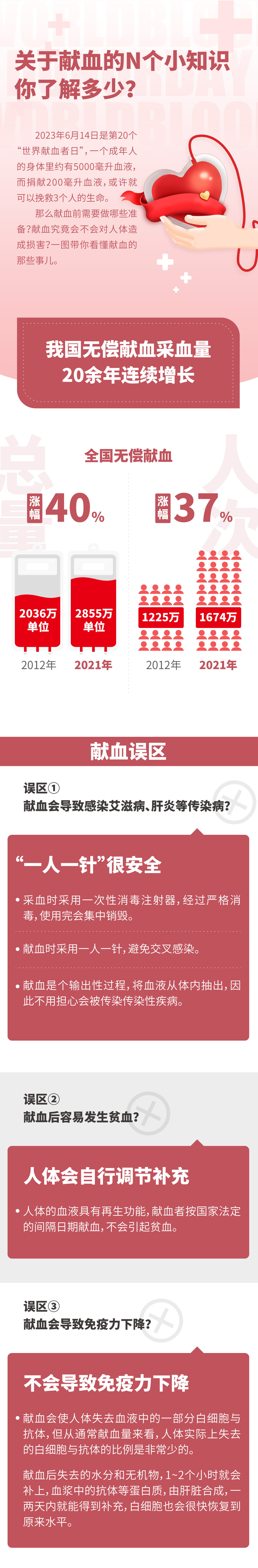 2023年6月14日是第20個“世界獻(xiàn)血者日”,一個成年人的身體里約有5000毫升血液,而捐獻(xiàn)200毫升血液,或許就可以挽救3個人的生命。那么獻(xiàn)血前需要做哪些準(zhǔn)備?獻(xiàn)血究竟會不會對人體造成損害?戳圖帶你看懂獻(xiàn)血那些事兒↓↓↓