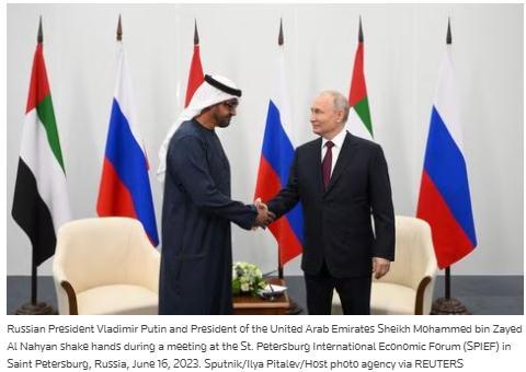 當?shù)貢r間16日,阿聯(lián)酋總統(tǒng)穆罕默德·本·扎耶德·阿勒納哈揚與俄羅斯總統(tǒng)普京在圣彼得堡國際經(jīng)濟論壇會晤。圖片來源:路透社報道截圖