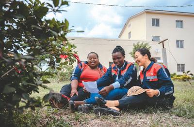 中國師父陳玲(右)是非洲之星鐵路運營公司工電部電子設備檢修工區(qū)工長。在肯尼亞工作4年來,她見證了女學員們電務技術的成長?!艾F(xiàn)在她們都能獨當一面?!标惲嵴f。朱迪思(左)是陳玲的學員之一,她從師父那里獲得的不僅是技術,工作間隙對飲食、文化等多維度的交流同樣讓她受益匪淺?!拔覀冎g是師徒,更是姐妹?!敝斓纤颊f。圖為陳玲在休息時教學員唱中文歌曲。