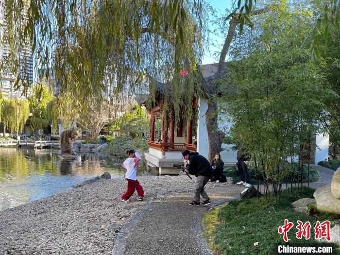 在湖邊,中國戲曲元素結(jié)合英文說唱的音樂吸引了游客們駐足。在悉尼從事汽修工作十余年的華人楊女士帶著兒子艾迪在湖邊拍攝音樂短視頻。穿著印有紅色京劇臉譜衛(wèi)衣的艾迪伴著動(dòng)感音樂起舞。“我非常喜歡這里中西結(jié)合的感覺。希望在公共場(chǎng)合拍攝能培養(yǎng)孩子的自信心。”楊女士說。