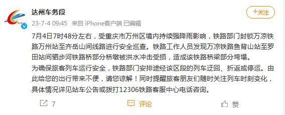 中新網(wǎng)7月4日電 據(jù)成都鐵路局達(dá)州車務(wù)段官方微博消息,7月4日7時48分左右,受重慶市萬州區(qū)境內(nèi)持續(xù)強(qiáng)降雨影響,鐵路部門封鎖萬涼鐵路萬州站至齊岳山間線路進(jìn)行安全巡查。鐵路工作人員發(fā)現(xiàn)萬涼鐵路魚背山站至羅田站間駟步河鐵路橋部分橋墩被洪水沖擊受損,造成該鐵路橋梁部分垮塌。為確保旅客列車運(yùn)行安全,鐵路部門安排途經(jīng)該區(qū)段的列車迂回、折返或停運(yùn)。
