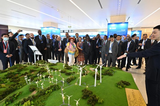 7月6日,駐華使節(jié)在國機集團國際化經(jīng)營成果展廳內(nèi)參觀由該集團承建的肯尼亞基佩托風(fēng)電項目沙盤。新華社記者 李鑫 攝