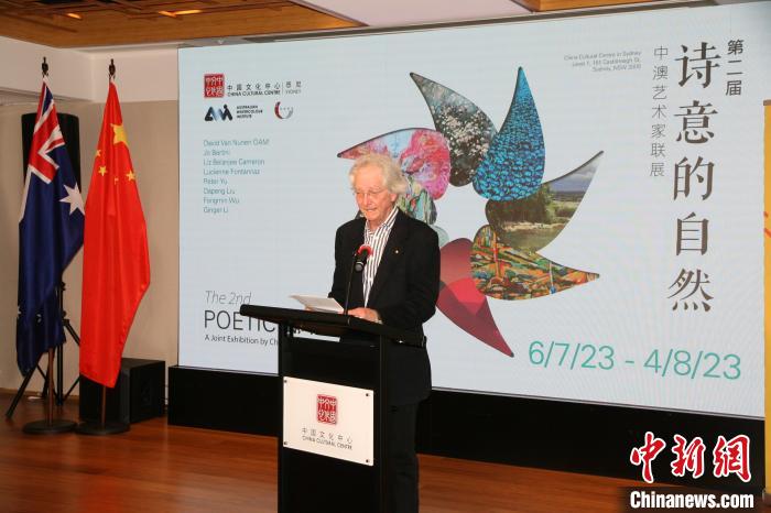 當(dāng)?shù)貢r間7月6日晚,第二屆“詩意的自然—中澳藝術(shù)家聯(lián)展”在悉尼開幕。圖為澳大利亞水彩畫協(xié)會主席大衛(wèi)·范·紐恩在開幕式上致辭。中新社記者 顧時宏 攝