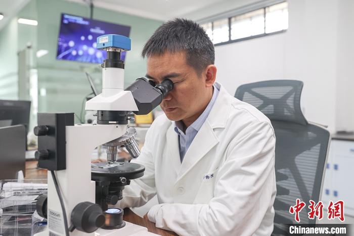圖為2023年6月19日,景德鎮(zhèn)古陶瓷基因庫實驗室內(nèi),景德鎮(zhèn)御窯博物院院長翁彥俊使用電子顯微鏡在觀察古陶瓷標本。 中新社記者 劉力鑫 攝