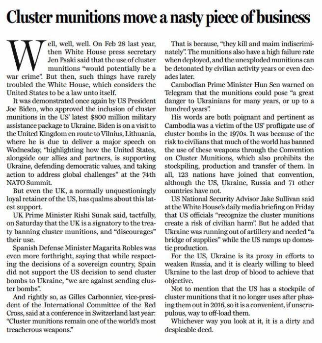對美國來說,烏克蘭是削弱俄羅斯的代理人,為了這一目的,美國顯然愿意讓烏克蘭流盡最后一滴血。其次,美國擁有大量集束彈藥, 2016年起逐步淘汰一批,現(xiàn)在打著援助烏克蘭的旗號(hào)也是一種處理方式。因此,無論怎么看,這都是一種骯臟下流、卑鄙無恥的行徑。