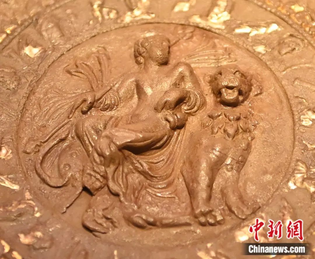 銀盤的外圈是希臘神話中的奧林匹斯十二主神。分布面積最大的是葡萄枝蔓,這是古代地中海沿岸比較典型的紋飾,還有蜥蜴、蜜蜂、昆蟲等小動物“隱蔽”其間。