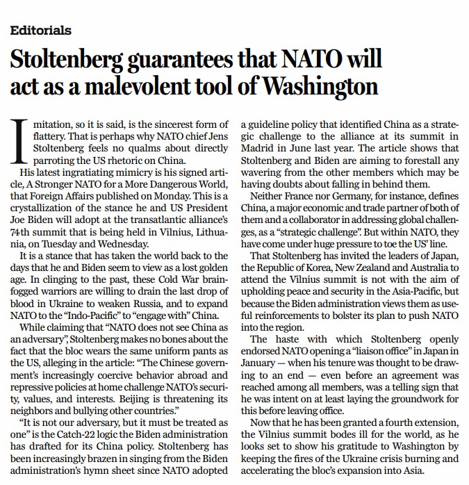他最近的模仿是于7月10日在《外交事務(wù)》上發(fā)表題為《更強(qiáng)大的北約,應(yīng)對更危險的世界》的署名文章,字里行間透露了他和美國總統(tǒng)拜登在北約峰會上的立場。為了固守過去,這些頭腦昏昏的冷戰(zhàn)“斗士”寧愿讓烏克蘭流盡最后一滴血,以削弱俄羅斯,并將北約擴(kuò)大到所謂“印太”地區(qū),遏制中國。