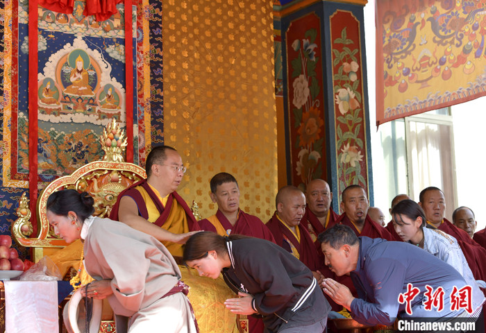 7月17日,班禪在雪林多吉頗章為信眾摸頂賜福。 中新社記者 李林 攝