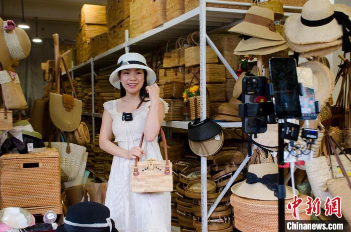 “這款純手工的東南亞藤編果盤,鑲有精美的貝殼,用來裝水果或點(diǎn)心,美觀實(shí)用?!弊哌M(jìn)廣西防城港市下轄的東興市電商直播帶貨城,主播一邊對著手機(jī)直播帶貨,一邊展示手中商品,一旁貨架上擺滿紅木、藤編等各式工藝品和家居用品。