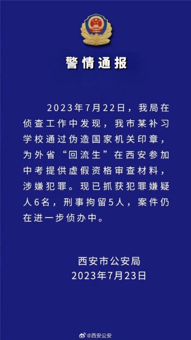 中新網(wǎng)7月23日電 據(jù)陜西省西安市公安局官方微博消息,西安市公安局23日發(fā)布警情通報稱,2023年7月22日,該局在偵查工作中發(fā)現(xiàn),西安市某補(bǔ)習(xí)學(xué)校通過偽造國家機(jī)關(guān)印章,為外省“回流生”在西安參加中考提供虛假資格審查材料,涉嫌犯罪。現(xiàn)已抓獲犯罪嫌疑人6名,刑事拘留5人,案件仍在進(jìn)一步偵辦中。