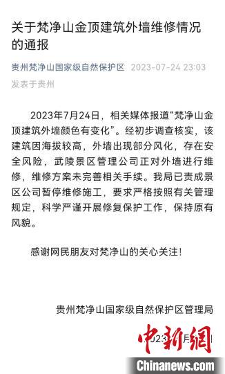 7月24日,有媒體報(bào)道“梵凈山金頂建筑外墻顏色有變化”,原本灰色墻體被刷成了粉紅色,不少網(wǎng)友提出疑問,梵凈山作為世界自然遺產(chǎn)地是否可以隨意粉刷?對(duì)此,管理局作出上述回應(yīng)。