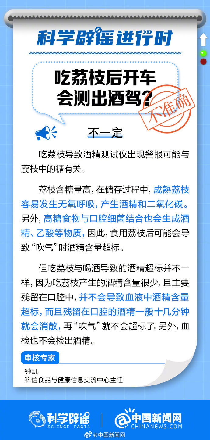 成熟荔枝容易發(fā)生無氧呼吸,產(chǎn)生酒精和二氧化碳。另外,高糖食物與口腔細(xì)菌結(jié)合也會生成酒精、乙酸等物質(zhì)。但吃荔枝產(chǎn)生的酒精含量很少,殘留在口腔的酒精一般十幾分鐘就會消散,血檢也不會檢出酒精。(來源:科學(xué)辟謠、中國新聞網(wǎng)微博)
