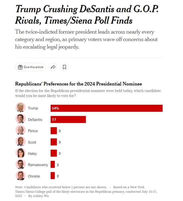 中新網(wǎng)7月31日電 據(jù)《紐約時報》報道,《紐約時報》和錫耶納學(xué)院31日公布了一項(xiàng)針對共和黨選民的聯(lián)合民意調(diào)查結(jié)果:在所有的共和黨總統(tǒng)競選人中,特朗普以54%的支持率取得絕對領(lǐng)先地位,超出第二位德桑蒂斯37%,其余候選人支持率均未超過3%。