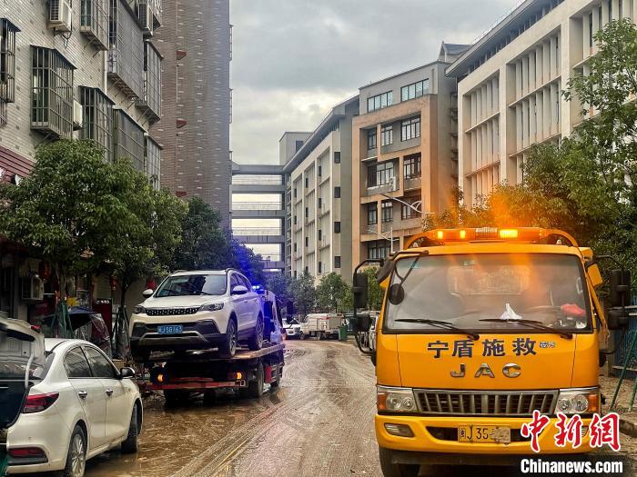 蘭田村內(nèi),救援車(chē)將一部部受損車(chē)輛拖離現(xiàn)場(chǎng)。呂巧琴 攝