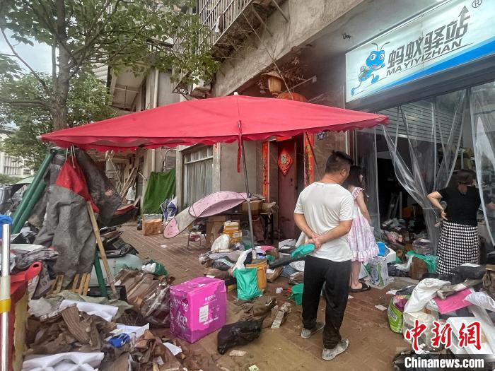 馮先生在蘭田村內(nèi)經(jīng)營(yíng)一家砂鍋米線(xiàn)店,積水退去,店內(nèi)人員正在清理器具,門(mén)口堆放著大量損失物品。呂巧琴 攝