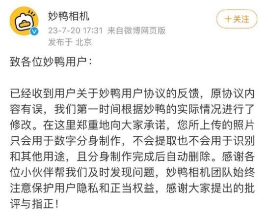 對此,妙鴨相機在7月20日回應稱,原協議內容有誤,并第一時間刪除了相關條款。