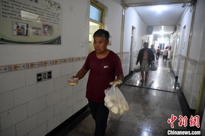8月1日晚,在涿州市職業(yè)技術教育中心臨時安置點,民眾剛領取晚飯?!≈行律缬浾?翟羽佳 攝