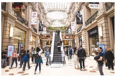 人們?cè)诎⒏⑹锥疾家酥Z斯艾利斯佛羅里達(dá)大街上的一座購物中心內(nèi)游覽。