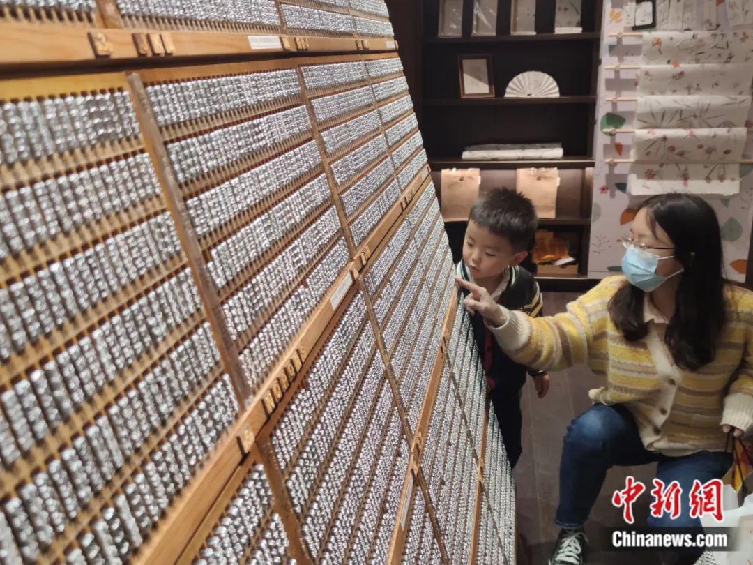 湖北武漢一書店內(nèi),一位母親給兒子講述中國古代四大發(fā)明之一印刷術(shù)的故事。李長林 攝