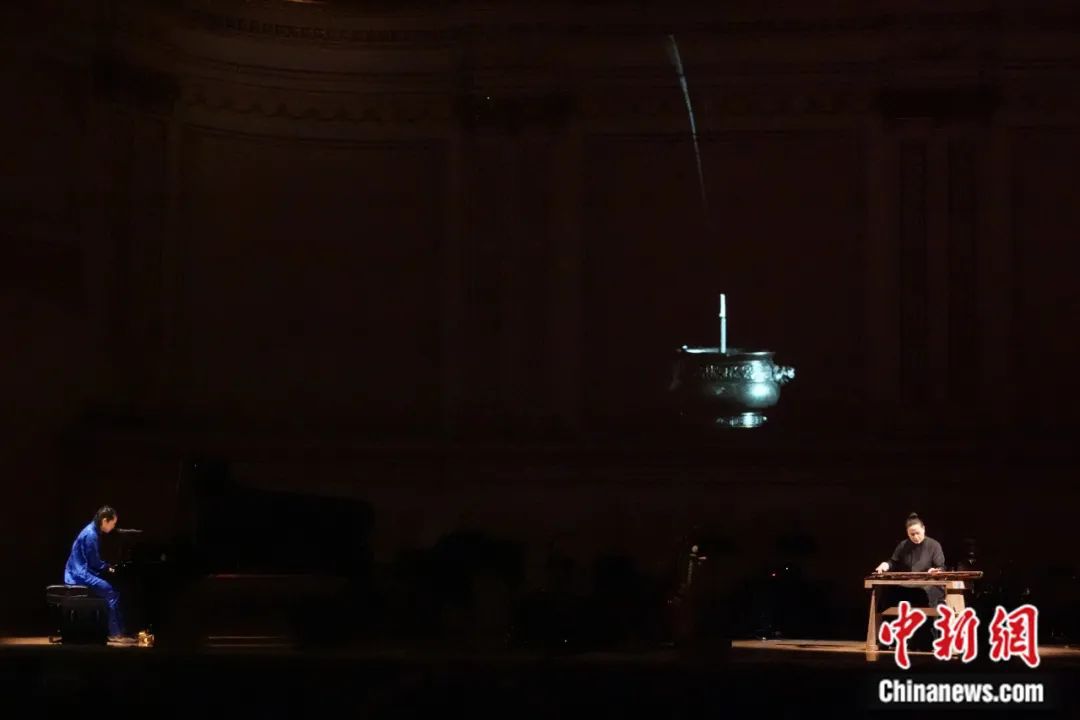 2023年7月1日,“紐約中美青年音樂節(jié)”在美國紐約卡內(nèi)基音樂廳舉行,來自中國和美國的青年音樂人演奏新國樂、實驗世界音樂、實驗民謠、新爵士樂,吸引當(dāng)?shù)赜^眾聆聽。圖為音樂人巫娜(右)與李帶菓以古琴和鋼琴演奏新國樂。廖攀 攝