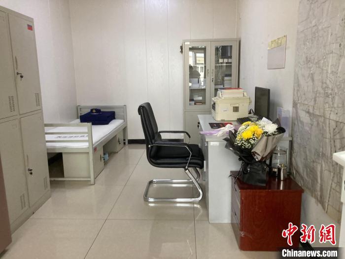 2023年8月,馮振在西小營小型站工作和生活的站長(zhǎng)室,墻上貼著馮振和隊(duì)員一起繪制的地圖?!≈行律缬浾?徐婧 攝