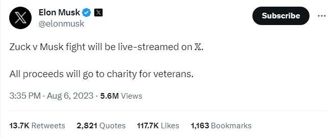 據(jù)報道,當(dāng)天,馬斯克在社交媒體X發(fā)文稱,“扎克伯格與馬斯克之戰(zhàn)將在X上直播。所有收益將捐給退伍軍人慈善機構(gòu)?!?/p>