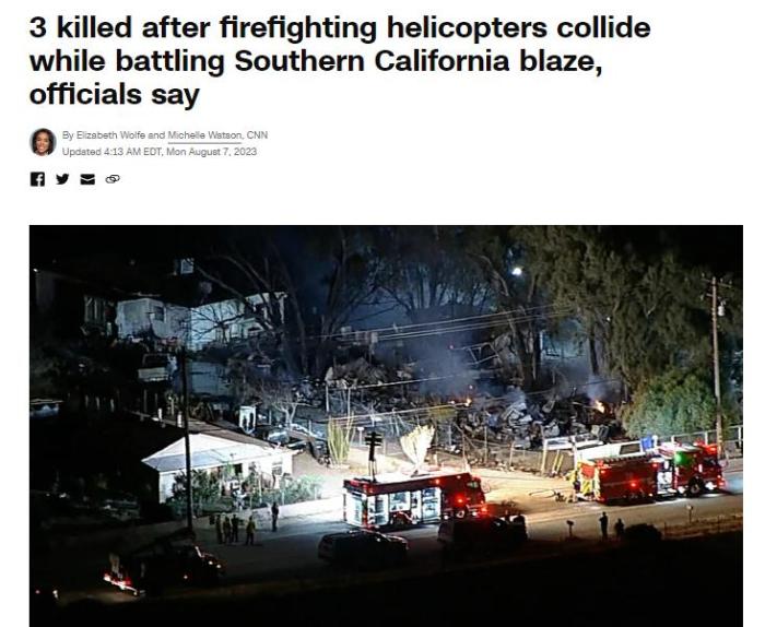 中新網8月7日電 綜合美媒報道,美國消防官員表示,當地時間8月6日,一架被派往加州撲滅野火的消防直升機與另一架消防直升機相撞,造成3人死亡。