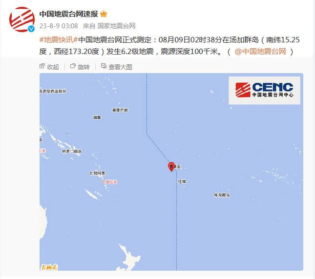 中國(guó)地震臺(tái)網(wǎng)正式測(cè)定:08月09日02時(shí)38分在湯加群島(南緯15.25度,西經(jīng)173.20度)發(fā)生6.2級(jí)地震,震源深度100千米。(國(guó)家地震臺(tái)網(wǎng)官方微博)