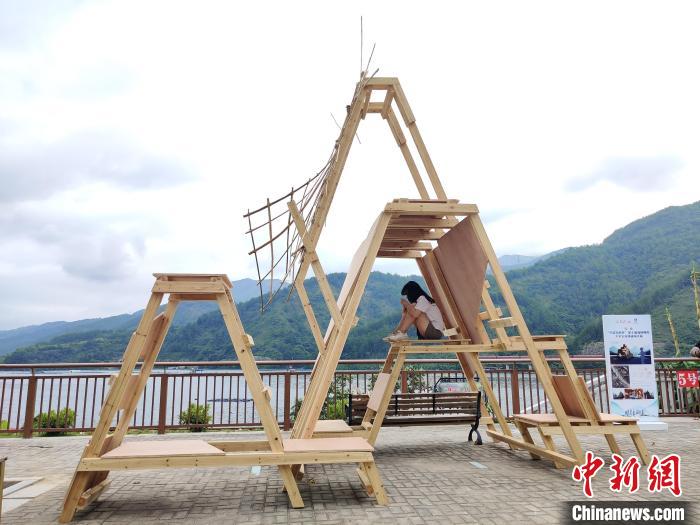 “高低起伏的木板,代表了環(huán)繞在雄江鎮(zhèn)旁的群山,座椅蜿蜒的形狀則是波浪滔滔的閩江?!眮碜耘_灣華夏科技大學(xué)的學(xué)生陳廷宇如是介紹作品《禹岳》。