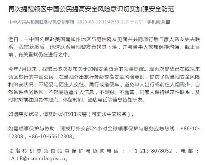 2023年7月以來,中國駐洛杉磯總領(lǐng)事館已多次發(fā)布關(guān)于加強(qiáng)安全防范的領(lǐng)事提醒?,F(xiàn)再次提醒已在或擬來領(lǐng)區(qū)旅行的中國公民,在當(dāng)?shù)赝獬雎眯袆?wù)必提高安全風(fēng)險意識,提前了解當(dāng)?shù)匕踩L(fēng)險和治安狀況,不輕易與陌生人交往、同行或搭便車,避免單人出行或前往人煙稀少、自然條件惡劣地區(qū),不輕易透露個人信息,不顯財、不露富,同家人保持經(jīng)常性聯(lián)系,及時將擬前往的具體地點、停留時間、酒店電話等信息告知親友。