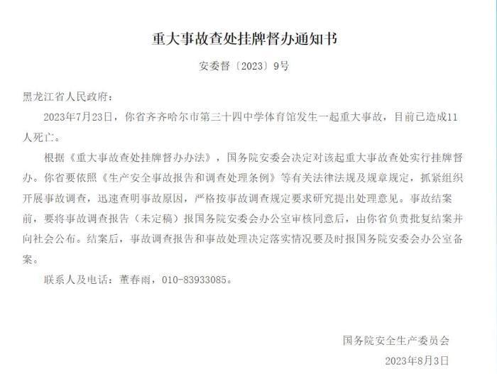 中新網(wǎng)8月14日電 據(jù)應(yīng)急管理部網(wǎng)站14日消息,國務(wù)院安委會發(fā)布重大事故查處掛牌督辦通知書。2023年7月23日,黑龍江省齊齊哈爾市第三十四中學(xué)體育館發(fā)生一起重大事故,目前已造成11人死亡。根據(jù)《重大事故查處掛牌督辦辦法》,國務(wù)院安委會決定對該起重大事故查處實(shí)行掛牌督辦。
