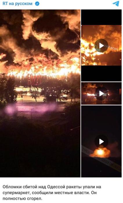 “今日俄羅斯”(RT)稱,在敖德薩上空被擊落的導彈碎片墜落在一家超市,超市被完全燒毀。此外,一所教育機構的宿舍樓也遭到破壞。