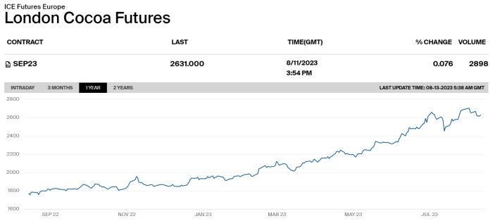 不僅僅是可可,制作巧克力所需的另一種主要成分食糖,今年以來(lái),期貨價(jià)格也持續(xù)處于高位。