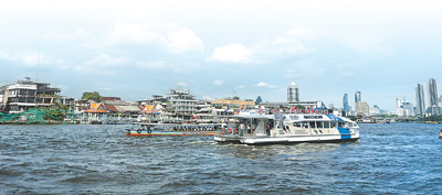 在泰國(guó)曼谷,游客乘船欣賞湄南河沿岸風(fēng)景。