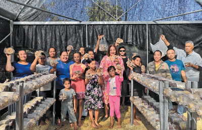 湯加示范戶(hù)阿拉尼一家在中國(guó)援助的食用菌大棚里采摘豐收的食用菌。