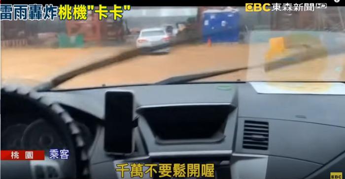 圖為臺灣桃園機(jī)場乘客涉水開車通過積水路面。圖片來源:臺灣東森新聞網(wǎng)視頻截圖