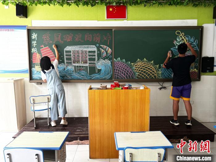8月18日,夏村中學(xué)教師丁玲和學(xué)生徐俊熙正在繪制迎接新學(xué)期的黑板報。中新社記者 呂少威 攝