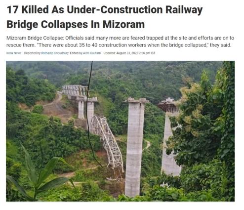 中新網(wǎng)8月23日電 據(jù)印度電視臺報道,當(dāng)?shù)貢r間23日,印度警方稱,米佐拉姆邦塞朗地區(qū)附近一座正在施工的鐵路橋倒塌,造成至少17名工人遇難。