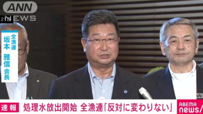 當?shù)貢r間24日下午,針對福島核污染水被正式排入大海,日本全國漁業(yè)協(xié)會聯(lián)合會(全漁聯(lián))表示:“反對核污染水排海的立場,沒有絲毫改變”。圖片來源:日本朝日電視臺視頻截圖