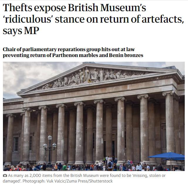 據(jù)報道,英國議會非洲賠償問題跨黨派小組主席貝爾·里貝羅·阿迪認為,1963年制定的禁止歸還帕特農(nóng)神廟大理石和貝寧青銅器等物品的法律應(yīng)該被修改。