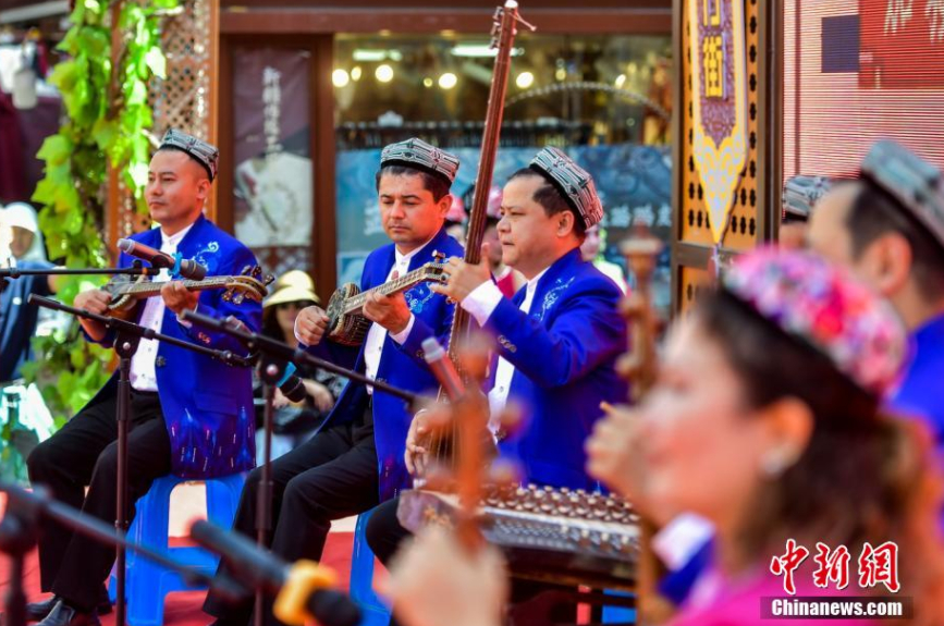新疆藝術(shù)劇院木卡姆藝術(shù)團(tuán)樂(lè)隊(duì)奉上樂(lè)器聯(lián)奏《多彩新疆》。劉新 攝