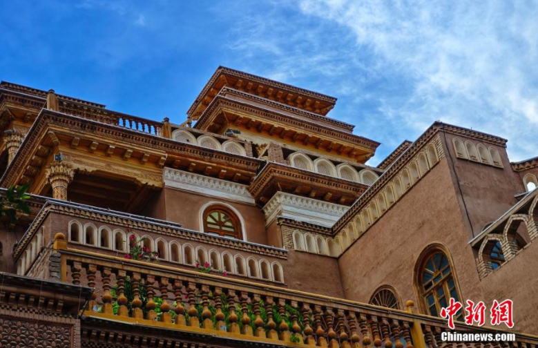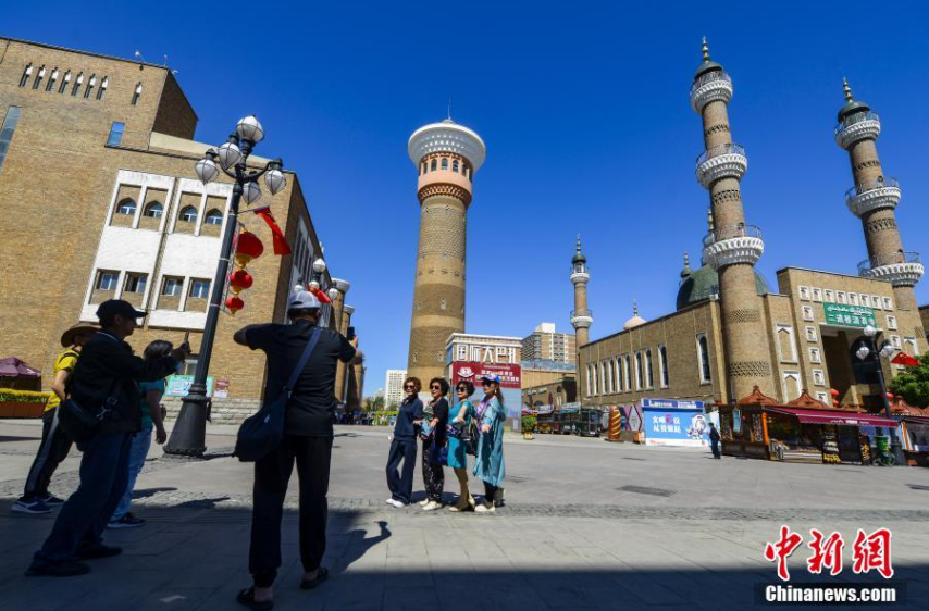 新疆國(guó)際大巴扎景區(qū),游客在地方特色建筑前參觀游覽。劉新 攝