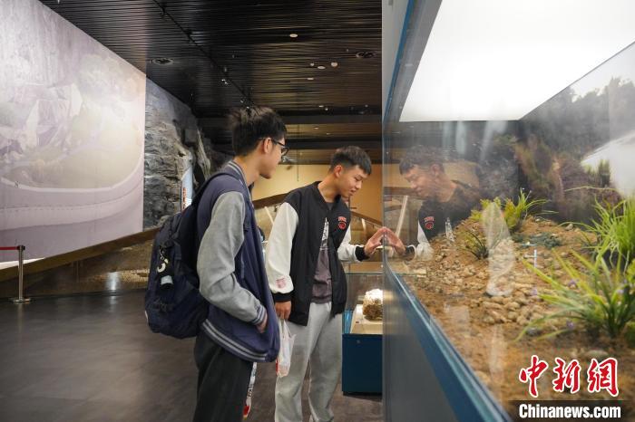 圖為今年5月,游客正在觀賞柳州白蓮洞洞穴科學(xué)博物館內(nèi)展出的螺螄殼化石。韋國政 攝