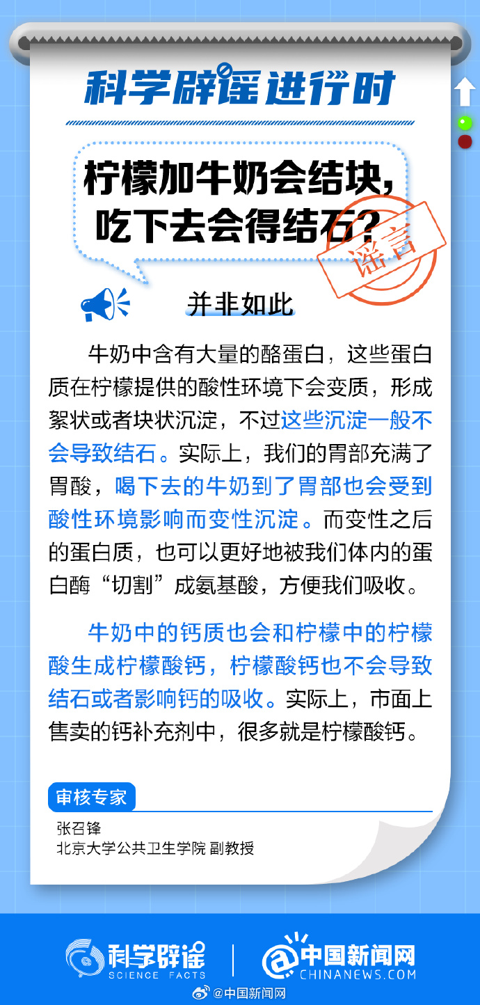 中新網8月29日電 牛奶中含有大量的酪蛋白,這些蛋白質在檸檬提供的酸性環(huán)境下會變質,形成絮狀或者塊狀沉淀,不過這些沉淀一般不會導致結石。牛奶中的鈣質也會和檸檬中的檸檬酸生成檸檬酸鈣,檸檬酸鈣也不會導致結石或者影響鈣的吸收。(來源:@科學辟謠 中國新聞網微博)