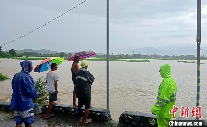9月3日,菲律賓北部南伊羅戈省圣盧西亞市,當?shù)鼐葹娜藛T在帕拉通社區(qū)一座大橋上查看水情。(菲律賓圣盧西亞市警察局 供圖)